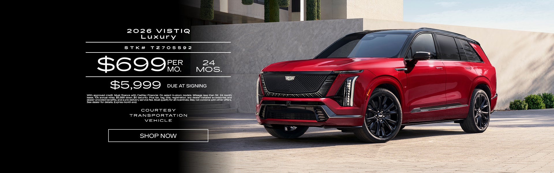With approved credit. Must finance with Cadillac Financial. On select in-stock models. Mileage less than 5K. 24 month lease, 10k annual miles. $5,999 down. $0 security. Plus tax, tag, title, registration, any dealer-installed accessories and dealer-provided benefits, and a pre-delivery service fee. Must qualify for all incentives. May not combine with other offers. See dealer for details. Expires 3/31/26.